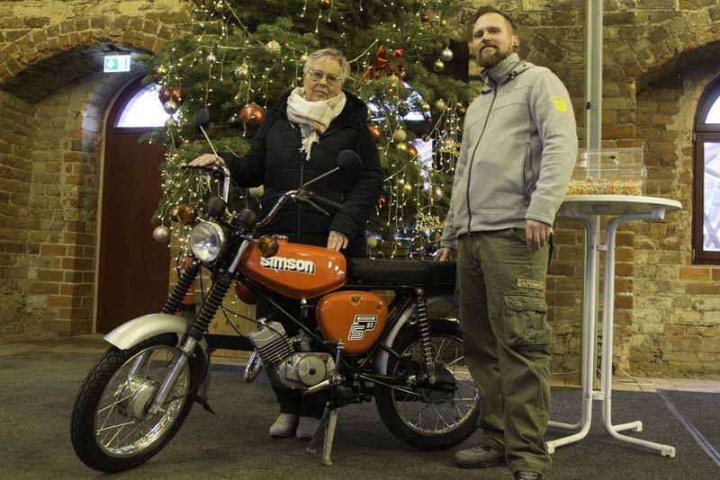 Ihr Papa moderierte die Veranstaltung. Und so wurde Sie kurzum zur Glücksfee auserkoren. Kerstin Borchert aus dem Vorstand der Bürgerstiftung Kulturerbe Himmelpfort überwachte die korrekte Ziehung. Das Erstaunen war natürlich sehr groß, als klar wurde, dass das Los wieder denselben Gewinner traf. Am Samstag holte Gehm freudig die Simson S51 Enduro aus Himmelpfort ab. Sie wird gemeinsam mit der Schwalbe reichlich von der Familie bewegt und gepflegt werden. Sein Vater freut sich schon sehr auf das neue Hobby im Ruhestand. Die Bürgerstiftung indes fordert Norman Gehm´s Glück nochmals heraus und ließ ihn zwei Lottoscheine komplett ankreuzen. In der Hoffnung auf einen Millionengewinn. Wermutstropfen für alle Teilnehmer, die leer ausgegangen sind: Der Erlös aus der Verlosung kommt ganz Himmelpfort zugute und wird für die nächsten Projekte zur Verbesserung der Infrastruktur und Aufwertung des Ortes eingesetzt.