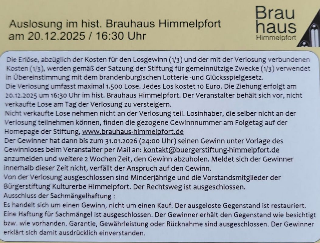 Nach der Schwalbe gibt es jetzt eine Enduro zu gewinnen. Eine rote Simson S51. Neu aufgebaut, mit revidiertem Motor, Bj. 84, frischem TÜV, im Wert von ca. 5000.- €. Es werden 1500 Lose zum Preis von je 10.- € ausgegeben. Die Bürgerstiftung Kulturerbe Himmelpfort initiiert diese Aktion wieder in Kooperation mit dem Zweiradhändler Norman Kleßny. Die Ziehung des Gewinnerloses findet am 20.12.2025 im Brauhaus Himmelpfort durch den Weihnachtsmann persönlich statt. Erhältlich sind die Lose im Brauhaus Himmelpfort, der Tourist-Information Fürstenberg/Havel oder online. Dafür benötigen sie ein PayPal-Konto. Dort können sie 10.- € je Los an die Mailadresse kontakt@buergerstiftung-himmelpfort.de senden. Zu finden im Menü unter "An ein PayPal-Konto senden". In dem Feld "Eine Mitteilung hinzufügen" hinterlegen sie ihre postalische Adresse. Ausserdem dürfen Sie auch noch eine Wunsch-Losnummer angeben. Wie z. B. 1234 oder 0555. Sie erhalten das Los per Post. Der Erlös wird wie immer für Projekte in Himmelpfort eingesetzt. Die Teilnahmebedingungen erhalten sie beim Veranstalter, den Vorverkaufsstellen oder auf www.himmelpfort.de. Viel Glück!